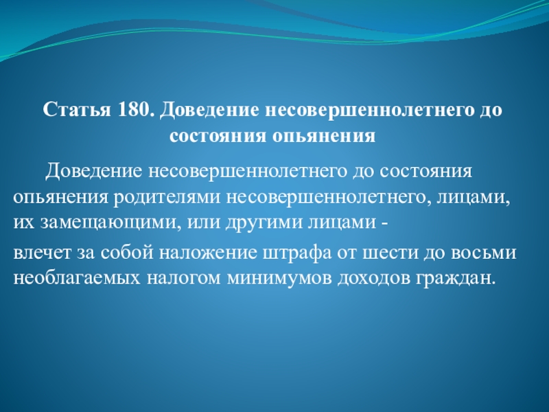 Слайд 58Статья 180. Доведение несовершеннолетнего до состояния опьянения