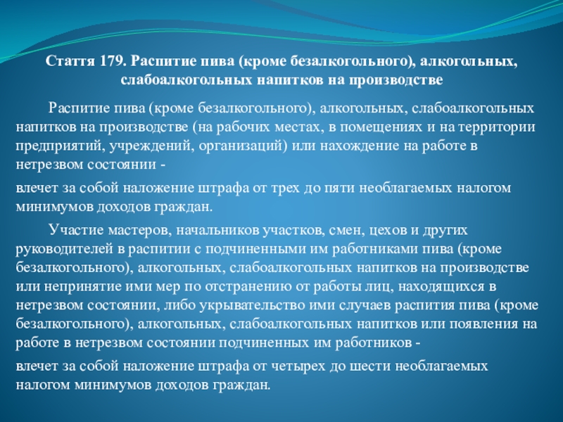 Слайд 57Стаття 179. Распитие пива (кроме безалкогольного), алкогольных, слабоалкогольных напитков на производстве