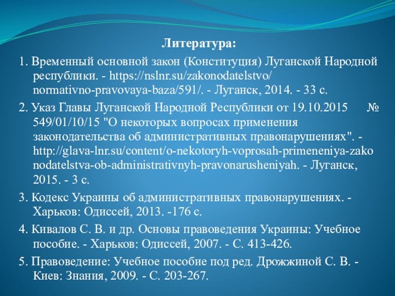 2. Указ Главы Луганской Народной Республики от 19.10.2015 № 549/01/10/15 "О некоторых вопросах применения законодательства об административных правонарушениях". - http://glava-lnr.su/content/o-nekotoryh-voprosah-primeneniya-zakonodatelstva-ob-administrativnyh-pravonarusheniyah. - Луганск, 2015. - 3 с.