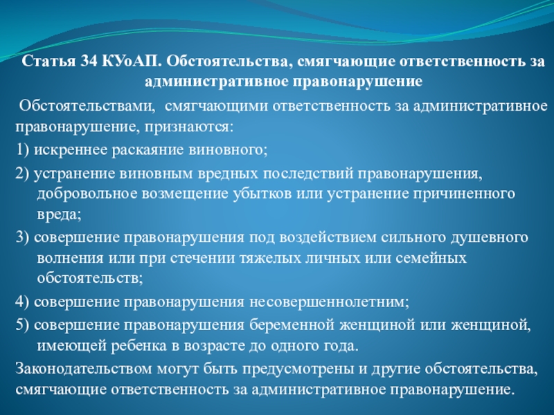 Слайд 52Статья 34 КУоАП. Обстоятельства, смягчающие ответственность за административное правонарушение