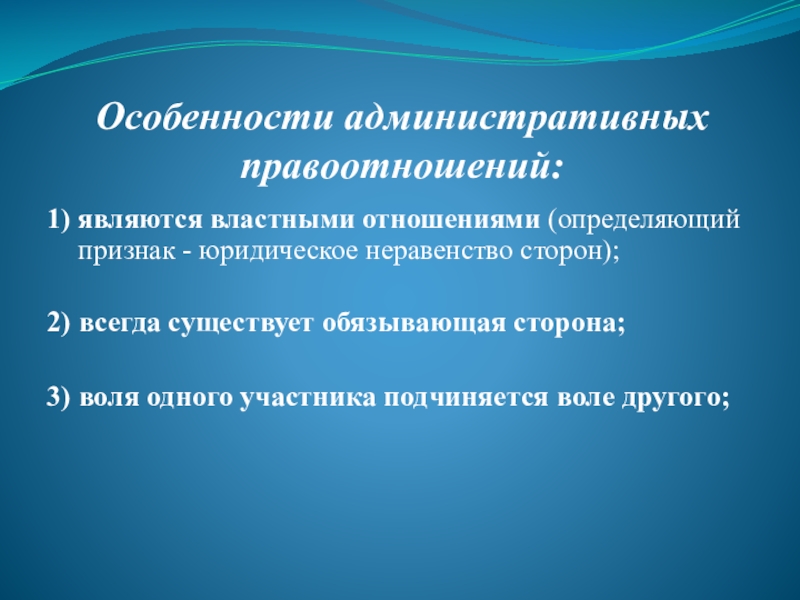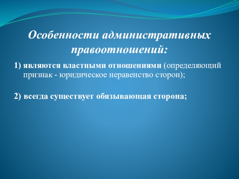 Слайд 12Особенности административных правоотношений: