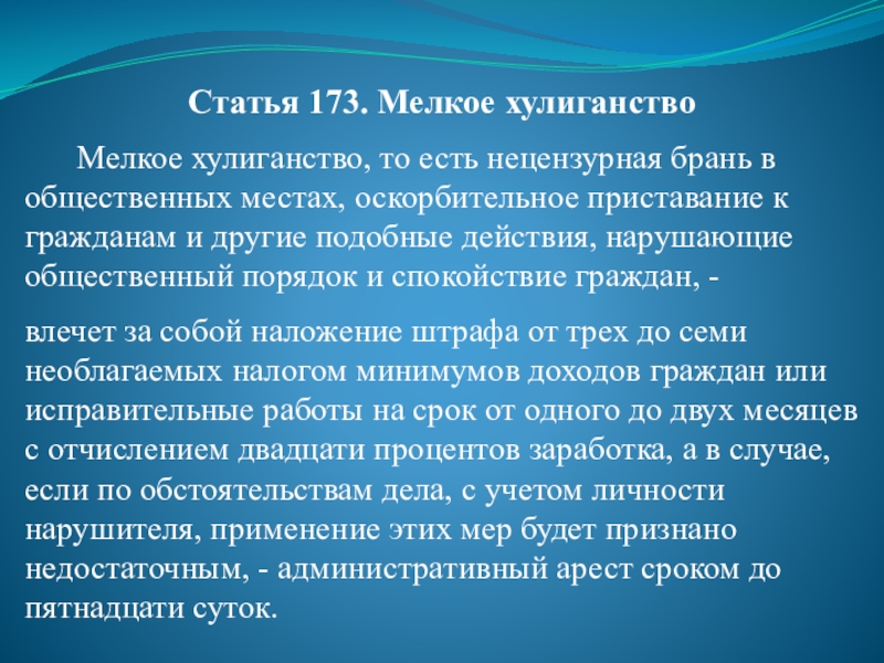 Слайд 54Статья 173. Мелкое хулиганство