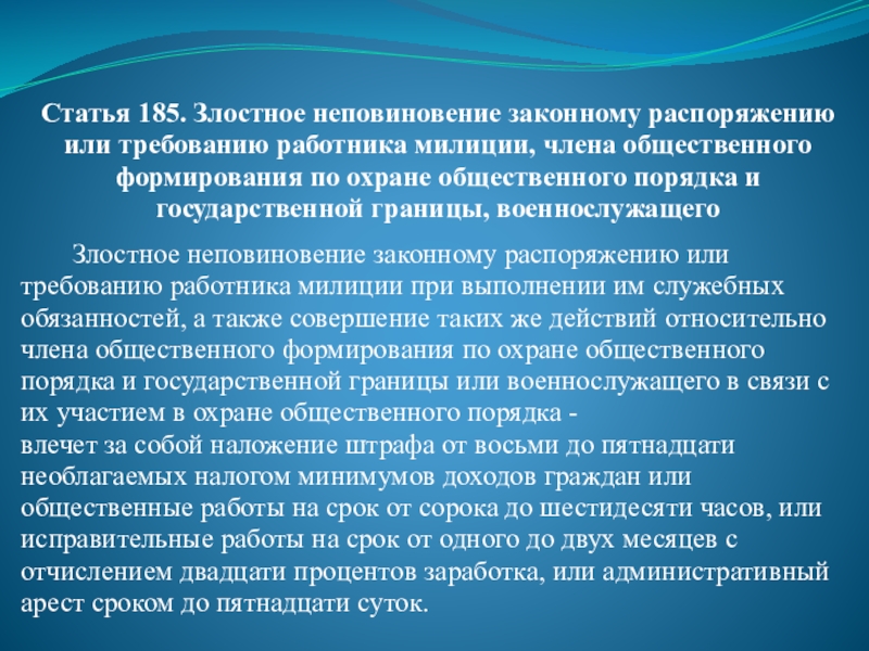 Слайд 59Статья 185. Злостное неповиновение законному распоряжению или требованию работника милиции, члена