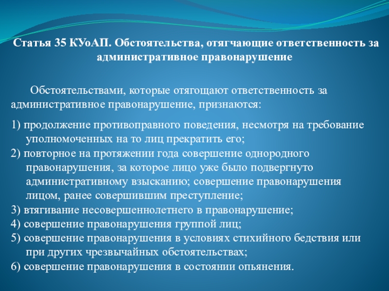 Слайд 53Статья 35 КУоАП. Обстоятельства, отягчающие ответственность за административное правонарушение