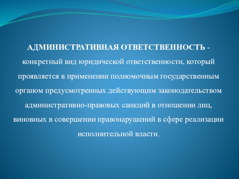 Слайд 38АДМИНИСТРАТИВНАЯ ОТВЕТСТВЕННОСТЬ - конкретный вид юридической ответственности, который проявляется в применении