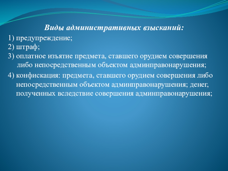 4) конфискация: предмета, ставшего орудием совершения либо непосредственным объектом админправонарушения; денег, полученных вследствие совершения админправонарушения;