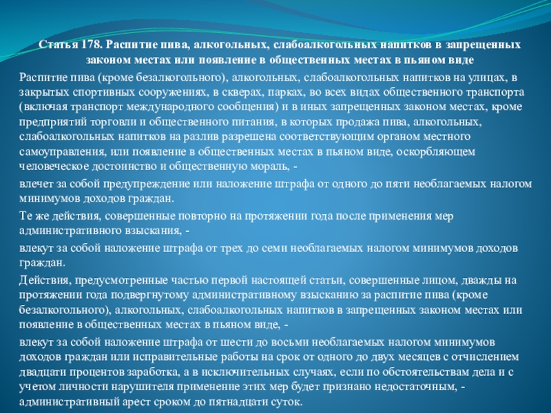 Слайд 56Статья 178. Распитие пива, алкогольных, слабоалкогольных напитков в запрещенных законом местах