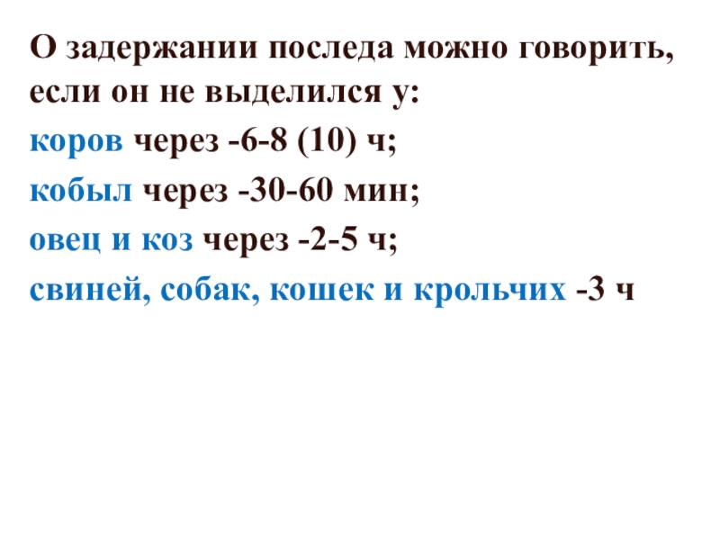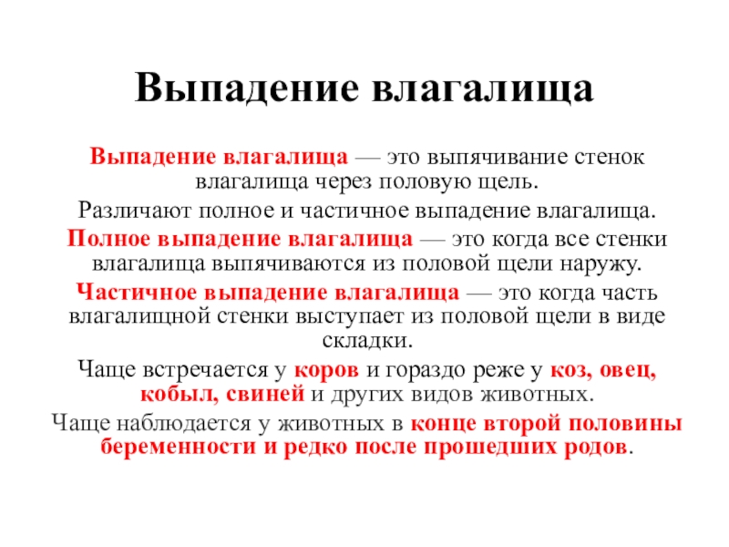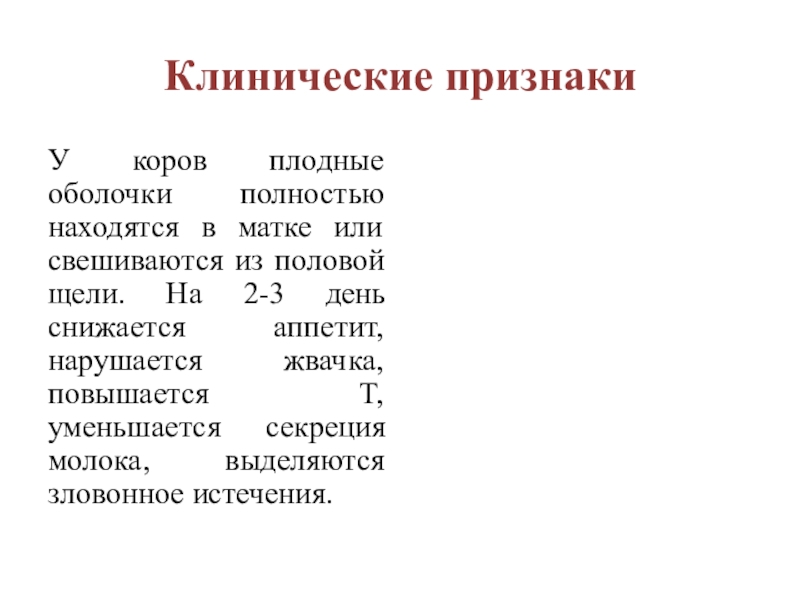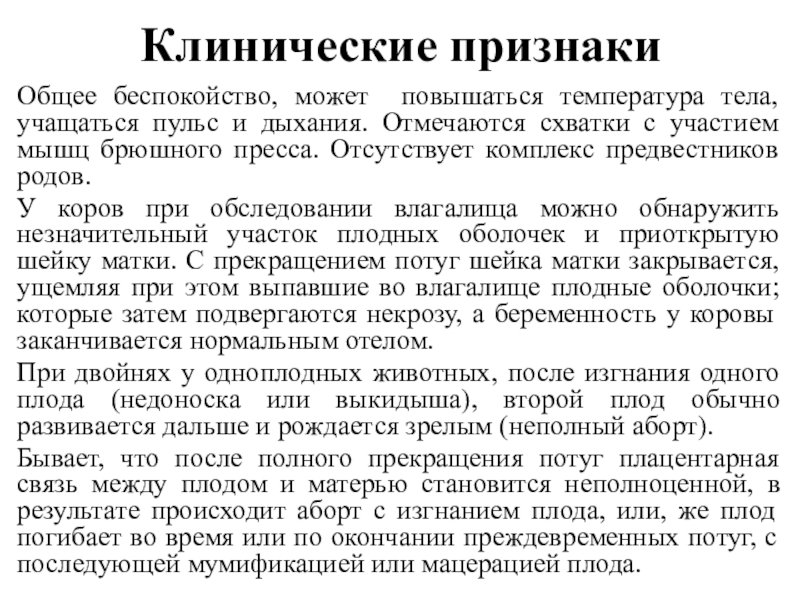 У коров при обследовании влагалища можно обнаружить незначительный участок плодных оболочек и приоткрытую шейку матки. С прекращением потуг шейка матки закрывается, ущемляя при этом выпавшие во влагалище плодные оболочки; которые затем подвергаются некрозу, а беременность у коровы заканчивается нормальным отелом.