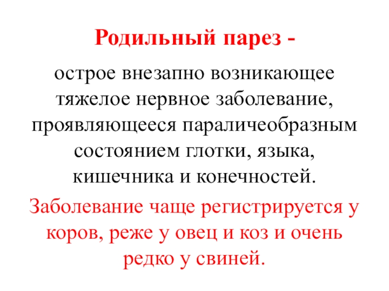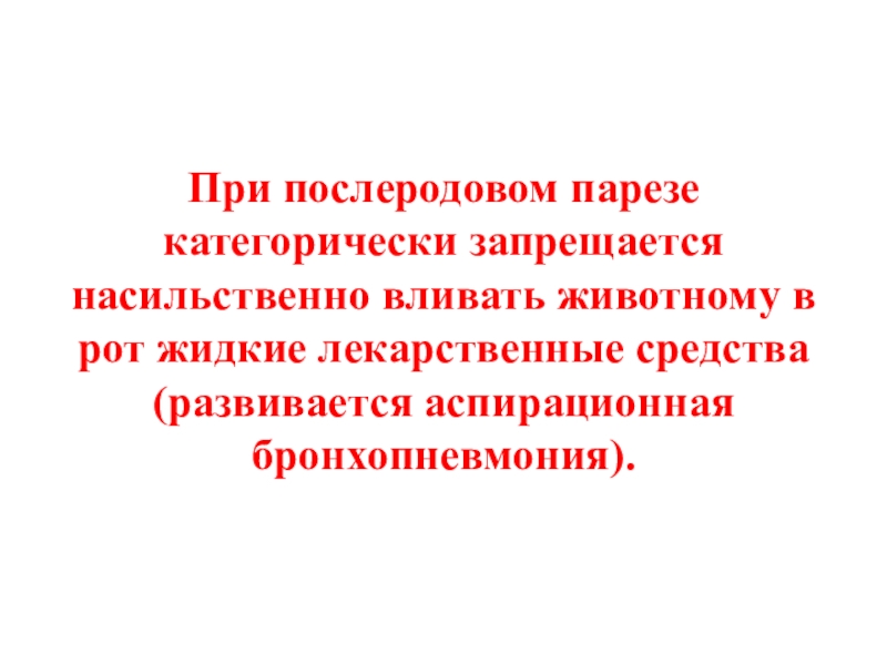 Слайд 110При послеродовом парезе категорически запрещается насильственно вливать животному в рот жидкие