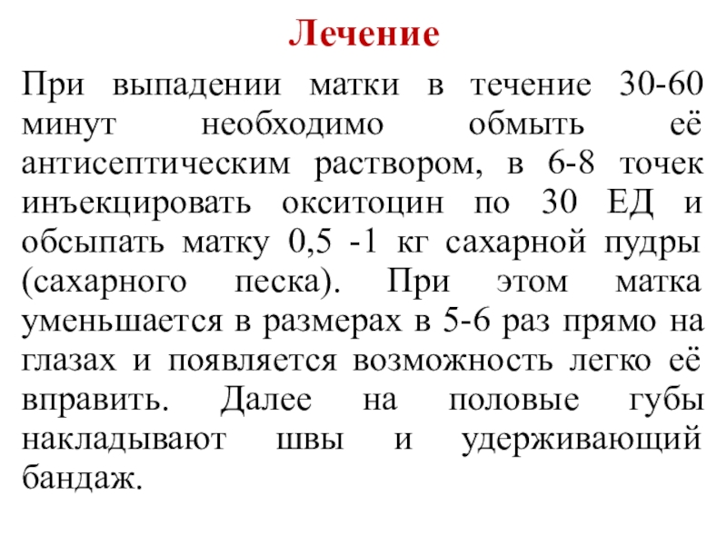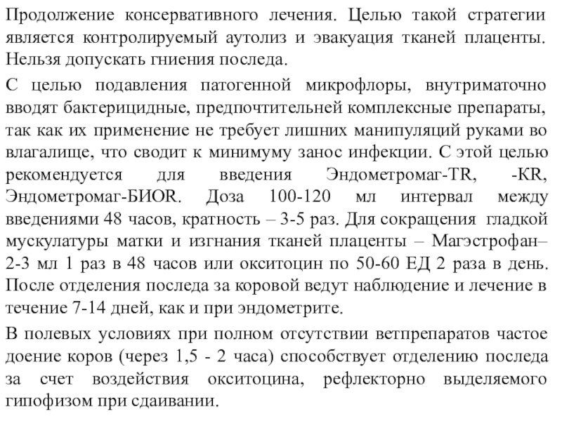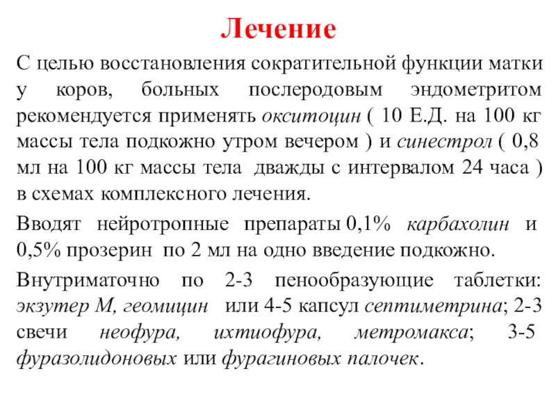 рекомендуется применять окситоцин ( 10 Е.Д. на 100 кг массы тела подкожно утром вечером ) и синестрол ( 0,8 мл на 100 кг массы тела дважды с интервалом 24 часа ) в схемах комплексного лечения.