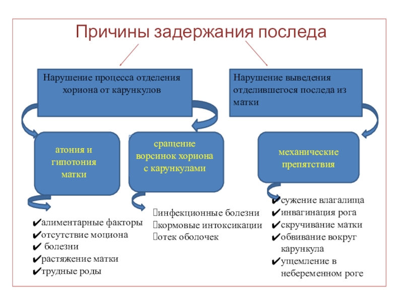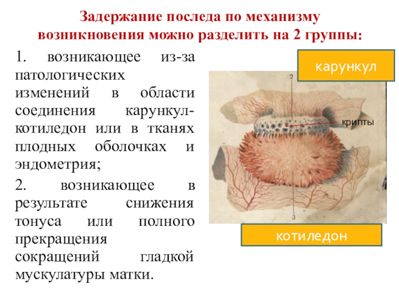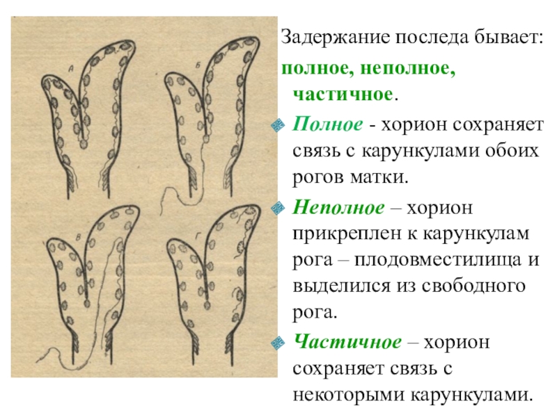 грубое оперативное отделение последа, отрыв карункулов от их ножек.