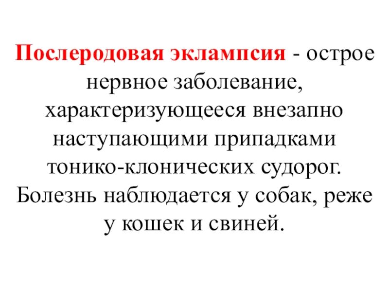 Слайд 100Послеродовая эклампсия - острое нервное заболевание, характеризующееся внезапно наступающими припадками тонико-клонических