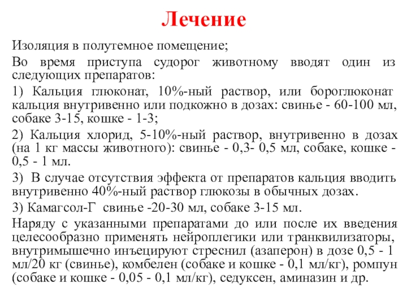 1) Кальция глюконат, 10%-ный раствор, или бороглюконат кальция внутривенно или подкожно в дозах: свинье - 60-100 мл, собаке 3-15, кошке - 1-3;