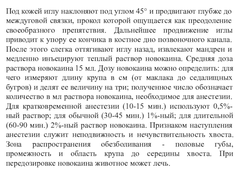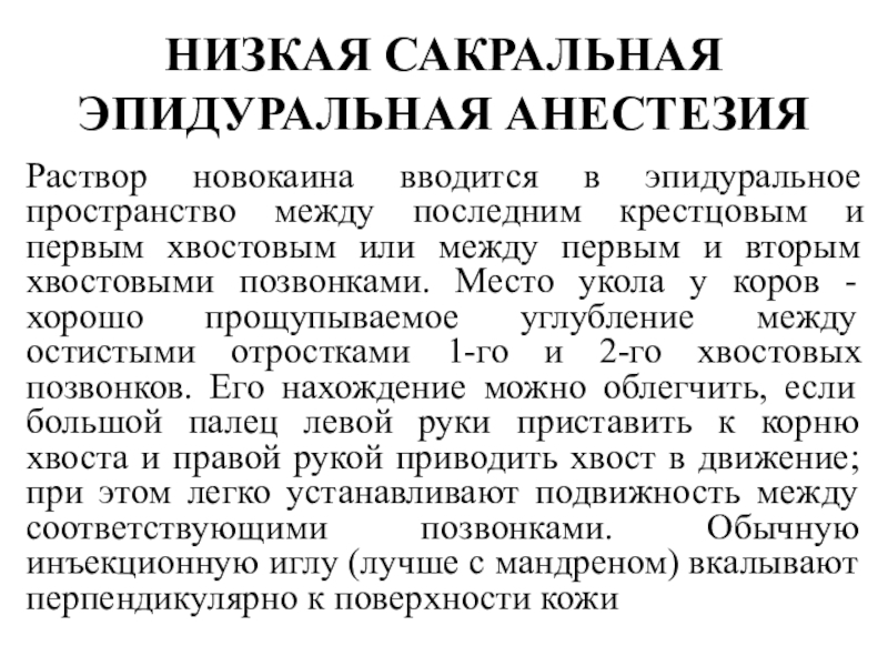 Эпидуральная анестезия- 1-2%-ный раствор новокаина 10-20 мл, подкожно атропина сульфат 1% - 0,5 мл.).