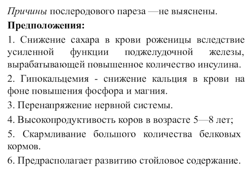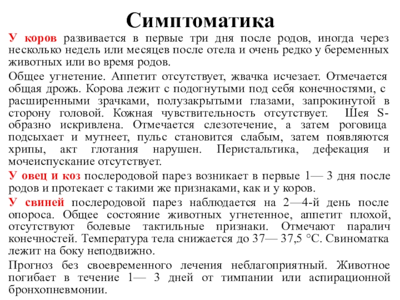 У овец и коз послеродовой парез возникает в первые 1— 3 дня после родов и протекает с такими же признаками, как и у коров.