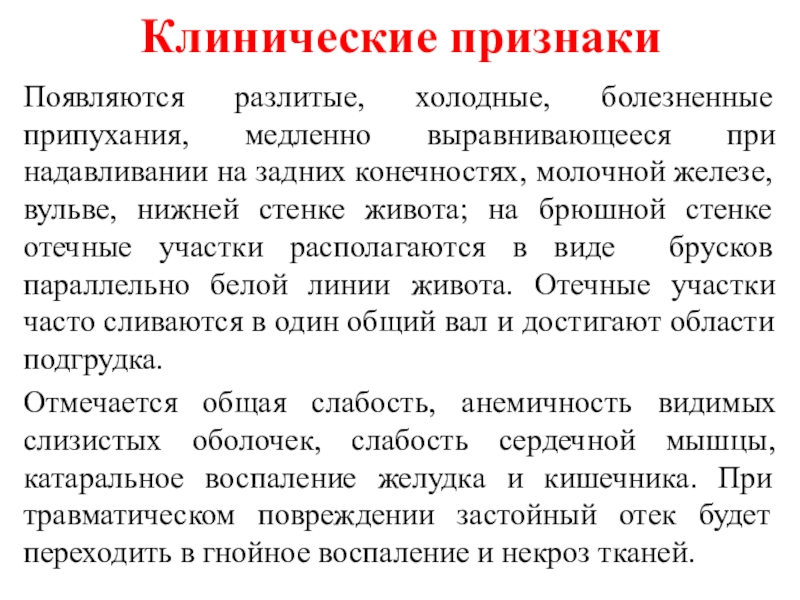 во время родов или в последние 2-3 недели беременности. Предшественники эклампсии: беспокойство или вялость, шаткая походка, переступание с конечности на конечность; уменьшается аппетит, повышается жажда, отмечается задержка мочи, иногда сильный отек молочный желез.