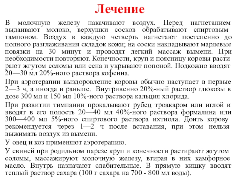 обрабатывают спиртовым тампоном. Воздух в каждую четверть нагнетают постепенно до полного разглаживания складок кожи; на соски накладывают марлевые повязки на 30 минут и проводят легкий массаж вымени. При необходимости повторяют. Конечности, круп и поясницу коровы растирают жгутом соломы или сена и укрывают попоной. Подкожно вводят 20—30 мл 20%-ного раствора кофеина.
