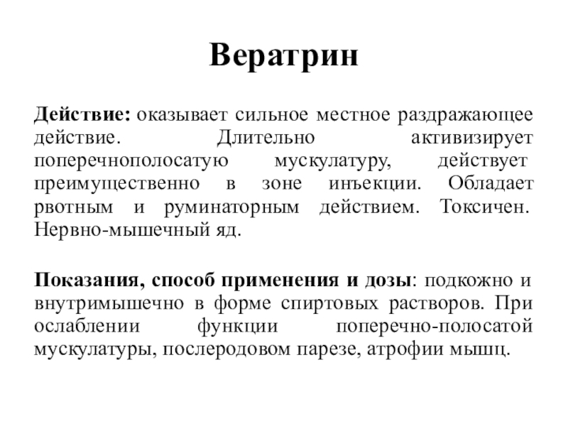 В начале болезни в/м в области крупа корове 0,5-1мл 0,5%-ного спиртового раствора вератрина, в 2-3точках с каждой стороны (всего 4-6 мл.), повторяют через 1-2 дня.