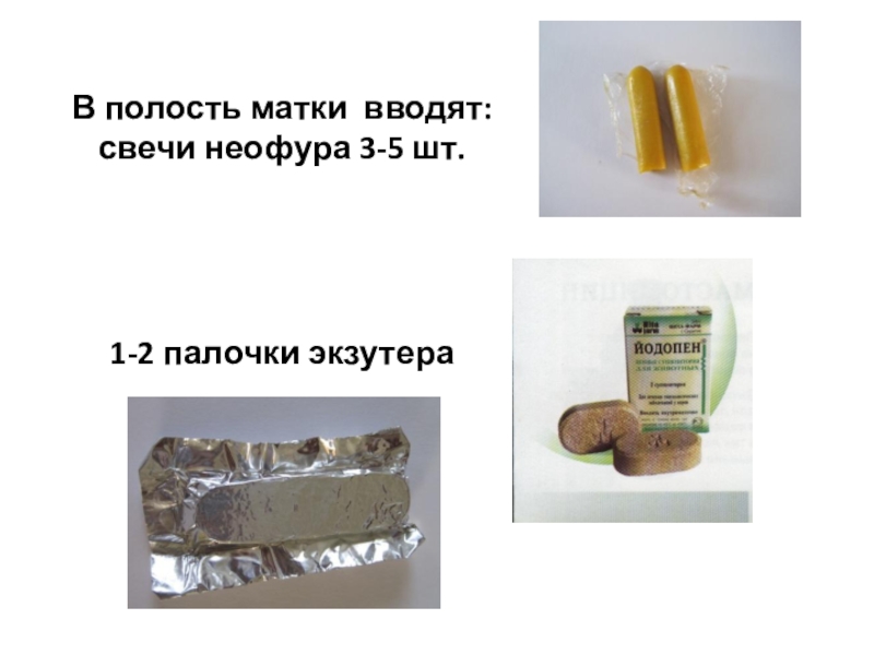 Внутриматочно по 2-3 пенообразующие таблетки: экзутер М, геомицин или 4-5 капсул септиметрина; 2-3 свечи неофура, ихтиофура, метромакса; 3-5 фуразолидоновых или фурагиновых палочек.