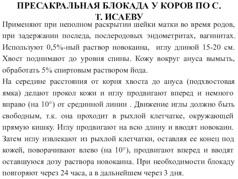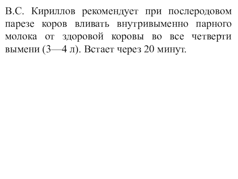 Слайд 109В.С. Кириллов рекомендует при послеродовом парезе коров вливать внутривыменно парного молока