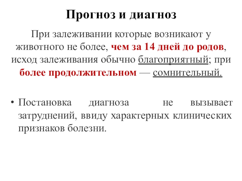 чем за 14 дней до родов, исход залеживания обычно благоприятный; при более продолжительном — сомнительный.