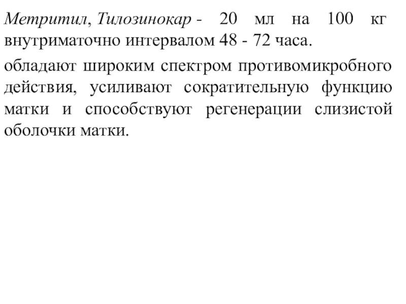 Слайд 98Метритил, Тилозинокар - 20 мл на 100 кг внутриматочно интервалом 48 - 72