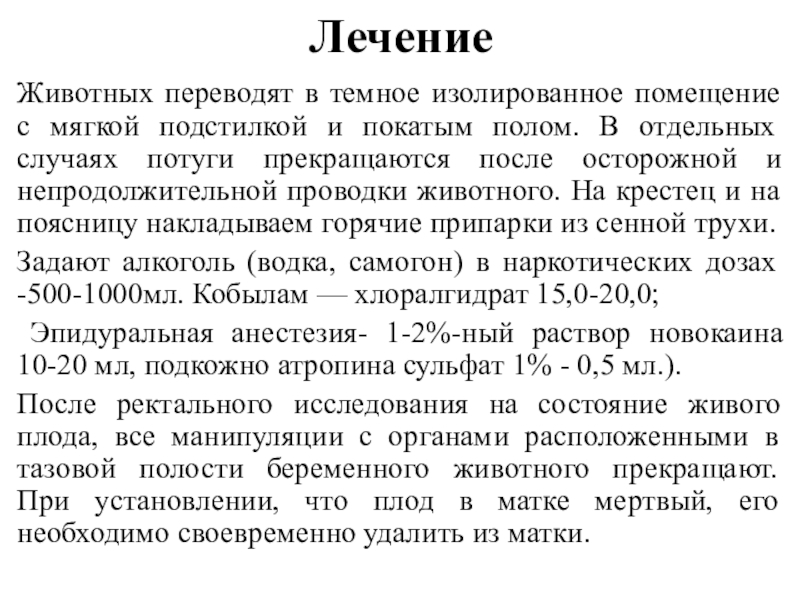 После ректального исследования на состояние живого плода, все манипуляции с органами расположенными в тазовой полости беременного животного прекращают. При установлении, что плод в матке мертвый, его необходимо своевременно удалить из матки.