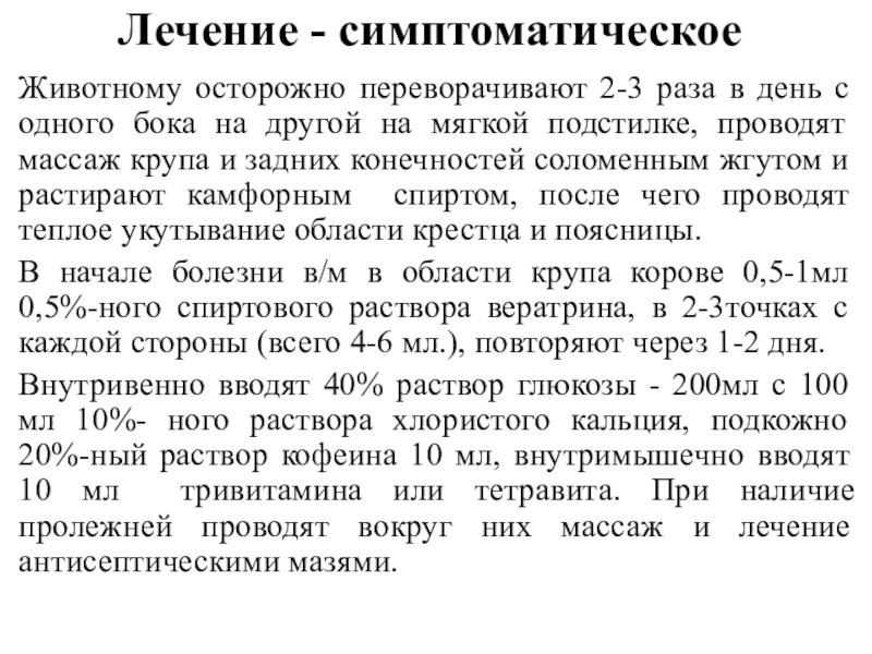 бока на другой на мягкой подстилке, проводят массаж крупа и задних конечностей соломенным жгутом и растирают камфорным спиртом, после чего проводят теплое укутывание области крестца и поясницы.
