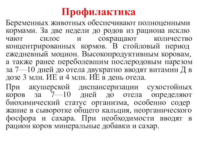 рациона исключают силос и сокращают количество концентрированных кормов. В стойловый период ежедневный моцион. Высокопродуктивным коровам, а также ранее переболевшим послеродовым парезом за 7—10 дней до отела двукратно вводят витамин Д в дозе 3 млн. ИЕ и 4 млн. ИЕ в день отела.
