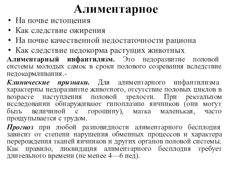 Алиментарный инфантилизм. Это недоразвитие половой системы молодых самок в сроки полового созревания вследствие недокармливания. -