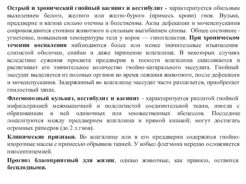 белого, желтого или желто-бурого (примесь крови) гноя. Вульва, преддверие и вагина сильно отечны и болезненны. Акты дефекации и мочеиспускания сопровождаются стонами животного и сильным выгибанием спины. Общее состояние - угнетение, повышения температуры тела у коров — гипогалактия. При хроническом течении воспаления наблюдаются более или менее значительные изъязвления слизистой оболочки, спайки и даже заращение влагалища. В некоторых случаях вследствие сужения просвета преддверия в полости влагалища скапливается и растягивает его значительное количество гнойно-катарального экссудата. Гнойный экссудат выделяется из половых органов во время лежания животного, после дефекации и мочеиспускания. Задержанный во влагалище экссудат часто разлагается, приобретает гнилостный запах.