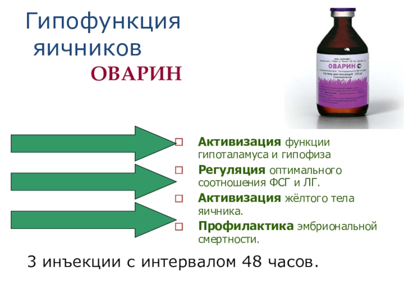 гипофункции и персистентных жёлтых телах яичников. Вводят внутримышечно в дозе 20-30 мл, трёхкратно, с интервалом 48 часов.
