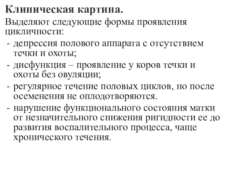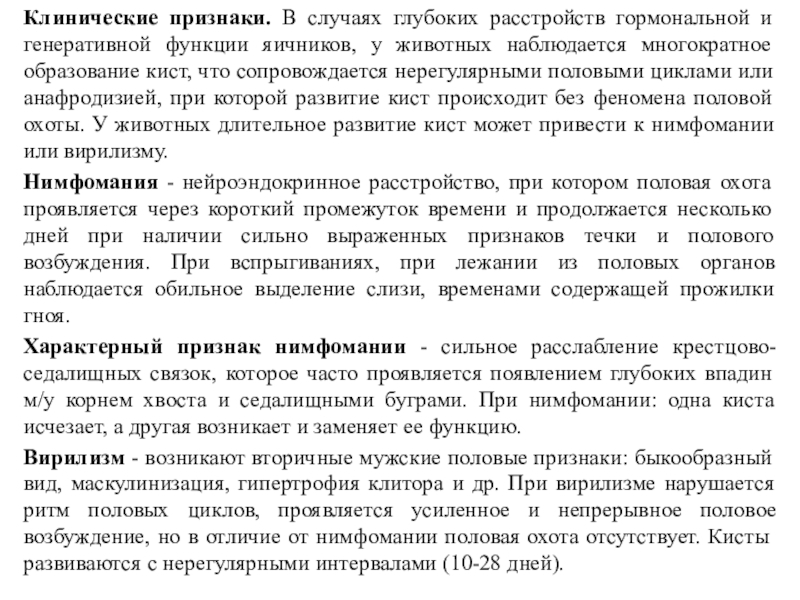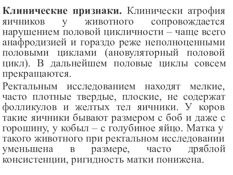 Слайд 18Клинические признаки. Клинически атрофия яичников у животного сопровождается нарушением половой цикличности