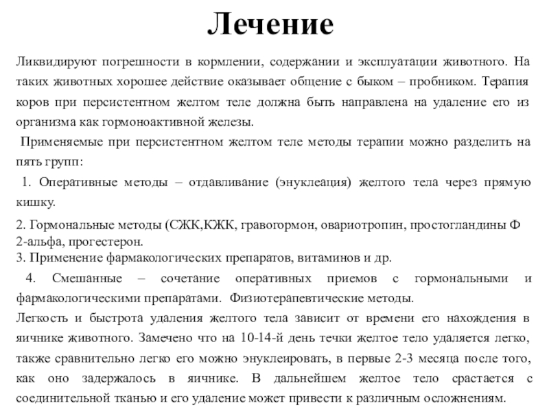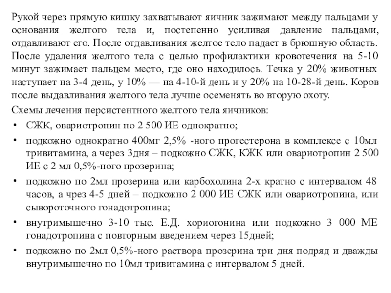 дают однократные внутримышечные введения хорионического гонадотропина в дозе 1000 ед. Течка устанавливается на 18-28-й день, после окончания течки на 6 день в одном из яичников определяют желтое тело. Кистозно-перерожденные яичники к указанному сроку уменьшаются в размерах, принимают овальную форму, исчезает флюктуация. У коров без признаков течки кисты рассасываются, яичники уменьшается в размерах.