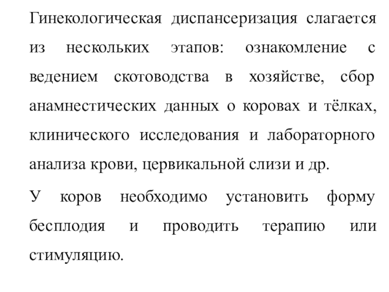 Слайд 43Гинекологическая диспансеризация слагается из нескольких этапов: ознакомление с ведением скотоводства в