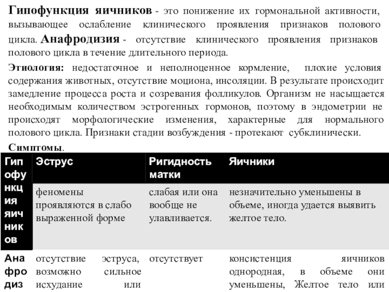 Слайд 14Гипофункция яичников - это понижение их гормональной активности, вызывающее ослабление клинического проявления