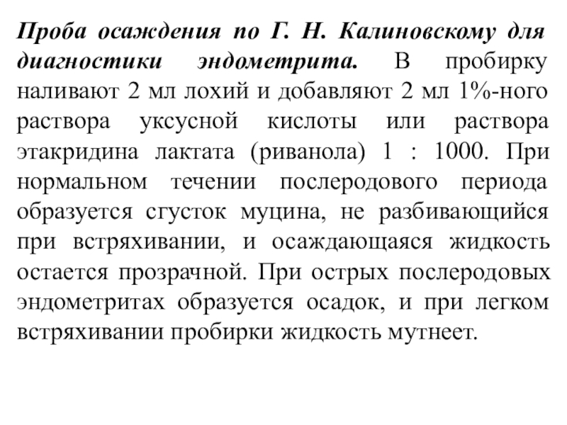 Слайд 48Проба осаждения по Г. Н. Калиновскому для диагностики эндометрита. В пробирку