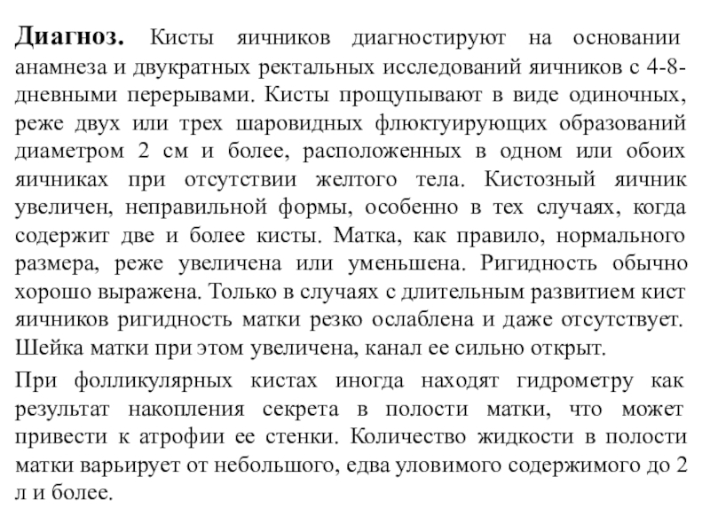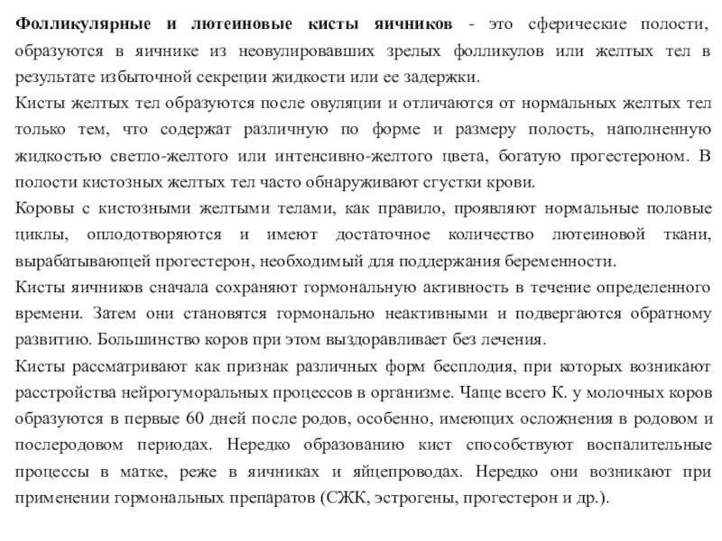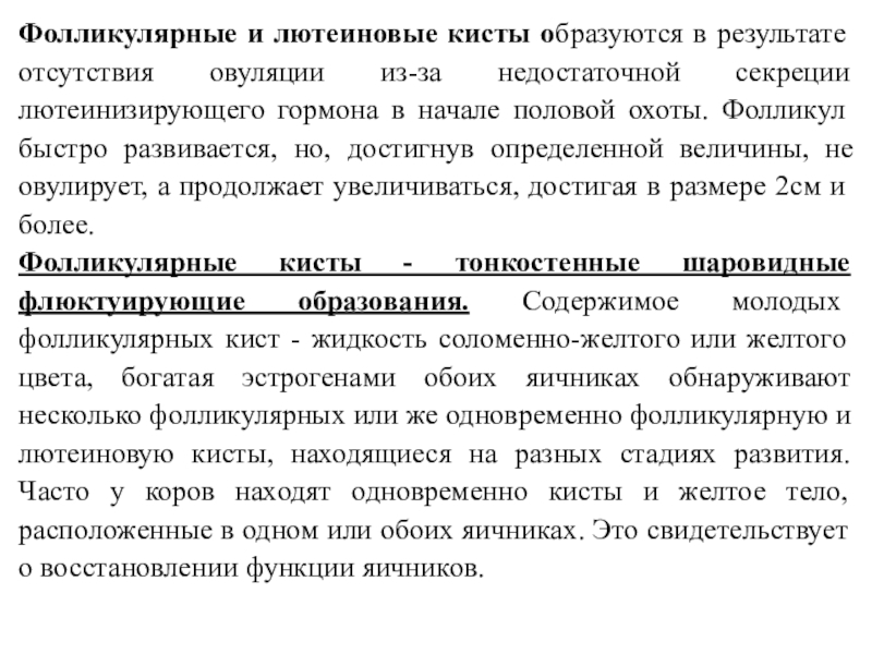 секреции лютеинизирующего гормона в начале половой охоты. Фолликул быстро развивается, но, достигнув определенной величины, не овулирует, а продолжает увеличиваться, достигая в размере 2см и более.