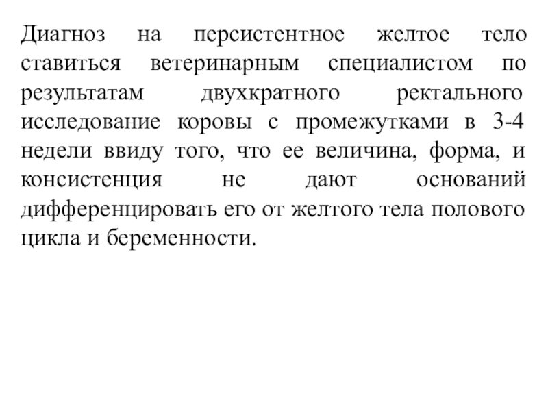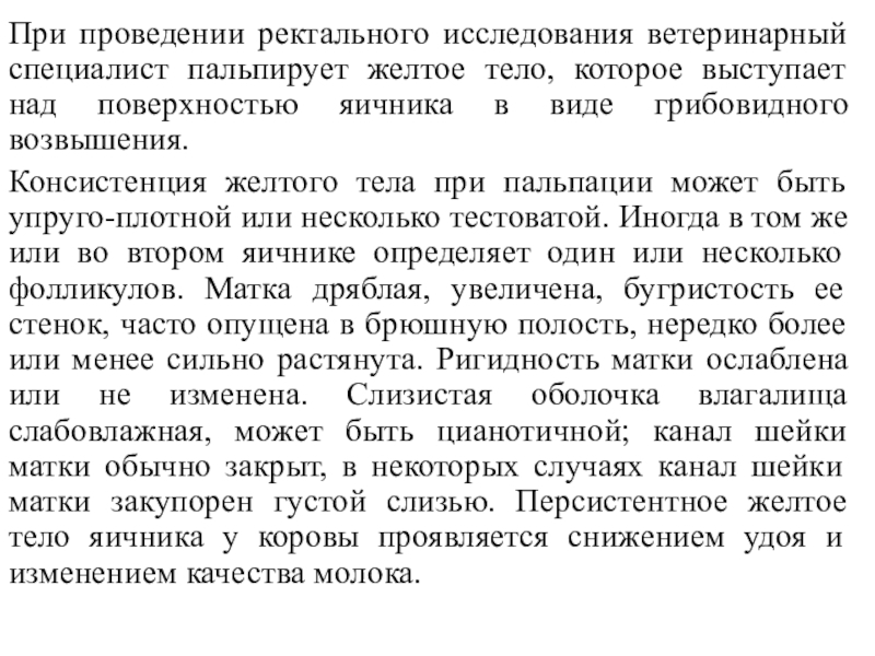 Ректальным исследованием находят мелкие, часто плотные твердые, плоские, не содержат фолликулов и желтых тел яичники. У коров такие яичники бывают размером с боб и даже с горошину, у кобыл – с голубиное яйцо. Матка у такого животного при ректальном исследовании уменьшена в размере, часто дряблой консистенции, ригидность матки понижена.
