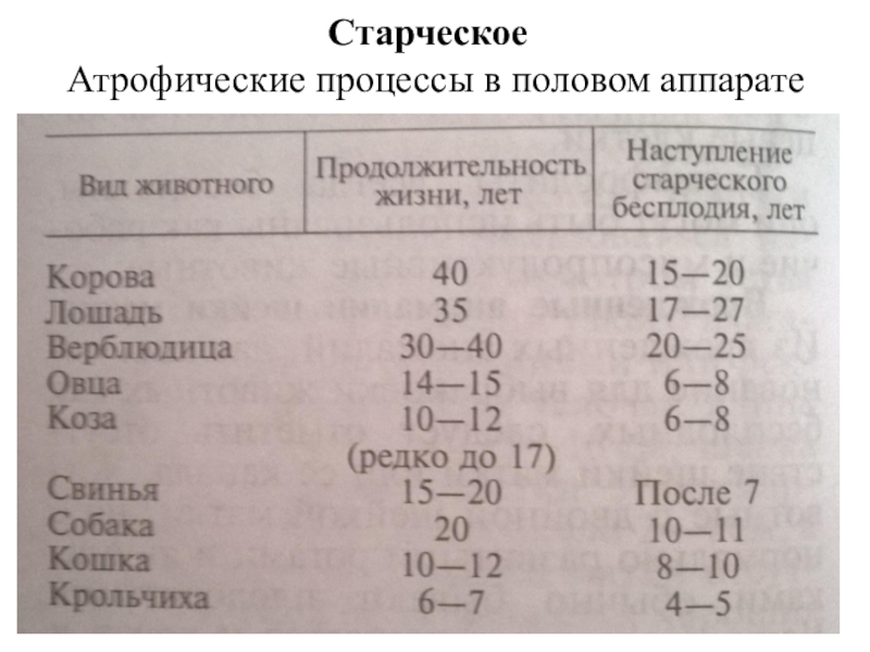 старость животного, с развитием дистрофических и атрофических процессов в фолликулярном эпителии. Подобного рода изменения могут захватывать весь яичник или развиваться участками, очагами. Из-за атрофии коркового и мозгового слоя яичник уменьшается в объеме. Из за нарушения функции яичников в крови отмечается значительная недостаточность эстрогенных гормонов и прогестерона. В виду этого в эндометрии животного происходят атрофические изменения, эндометрий истончается, и покрывается низким плазматическим эпителием. Обычно у животного атрофия яичников сопровождается и атрофией матки.