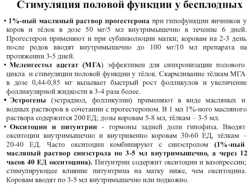Эстрогены (эстрадиол, фолликулин) применяют в виде масляных и водных растворов в сочетании с прогестероном. В 1 мл 1%-ного масляного раствора содержится 200 ЕД; дозы коровам 5-8 мл, тёлкам – 3-5 мл.