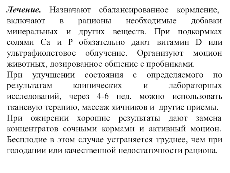 Слайд 8Лечение. Назначают сбалансированное кормление, включают в рационы необходимые добавки минеральных и
