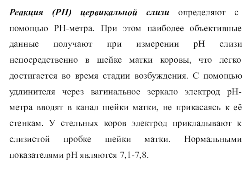 объективные данные получают при измерении рН слизи непосредственно в шейке матки коровы, что легко достигается во время стадии возбуждения. С помощью удлинителя через вагинальное зеркало электрод рН-метра вводят в канал шейки матки, не прикасаясь к её стенкам. У стельных коров электрод прикладывают к слизистой пробке шейки матки. Нормальными показателями рН являются 7,1-7,8.