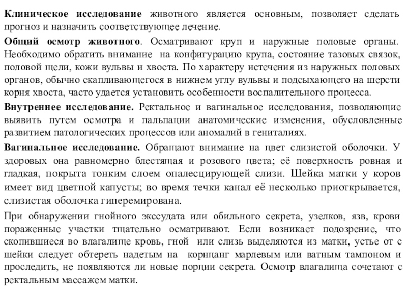 Вагинальное исследование. Обращают внимание на цвет слизистой оболочки. У здоровых она равномерно блестящая и розового цвета; её поверхность ровная и гладкая, покрыта тонким слоем опалесцирующей слизи. Шейка матки у коров имеет вид цветной капусты; во время течки канал её несколько приоткрывается, слизистая оболочка гиперемирована.