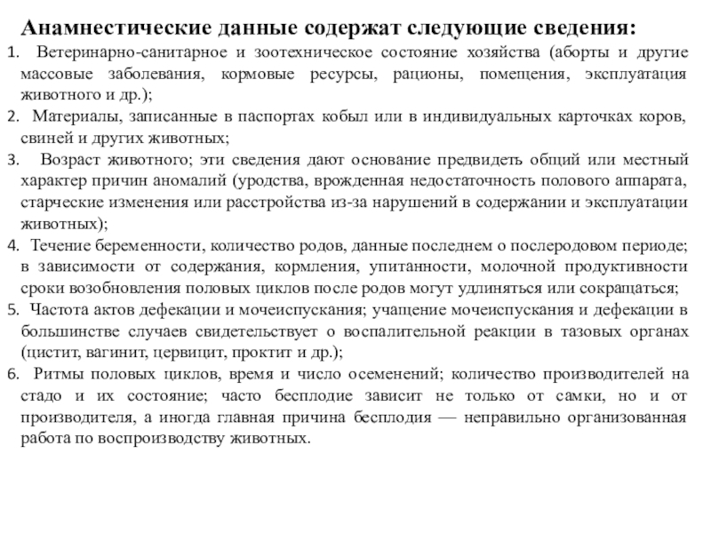 Возраст животного; эти сведения дают основание предвидеть общий или местный характер причин аномалий (уродства, врожденная недостаточность полового аппарата, старческие изменения или расстройства из-за нарушений в содержании и эксплуатации животных);