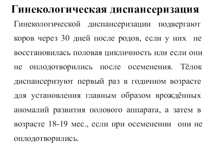 у них не восстановилась половая цикличность или если они не оплодотворились после осеменения. Тёлок диспансеризуют первый раз в годичном возрасте для установления главным образом врождённых аномалий развития полового аппарата, а затем в возрасте 18-19 мес., если при осеменении они не оплодотворились.