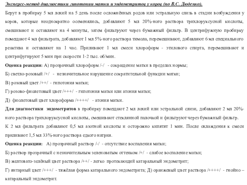 Слайд 49Эксперсс-метод диагностики гипотонии матки и эндометритов у коров (по В.С. Дюденко).