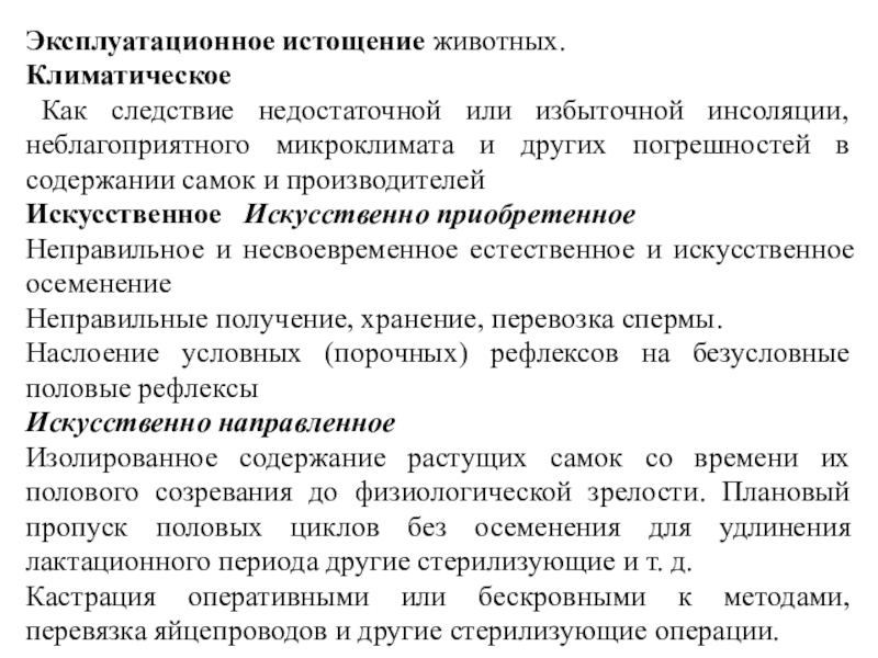 Ритмы половых циклов, время и число осеменений; количество производителей на стадо и их состояние; часто бесплодие зависит не только от самки, но и от производителя, а иногда главная причина бесплодия — неправильно организованная работа по воспроизводству животных.