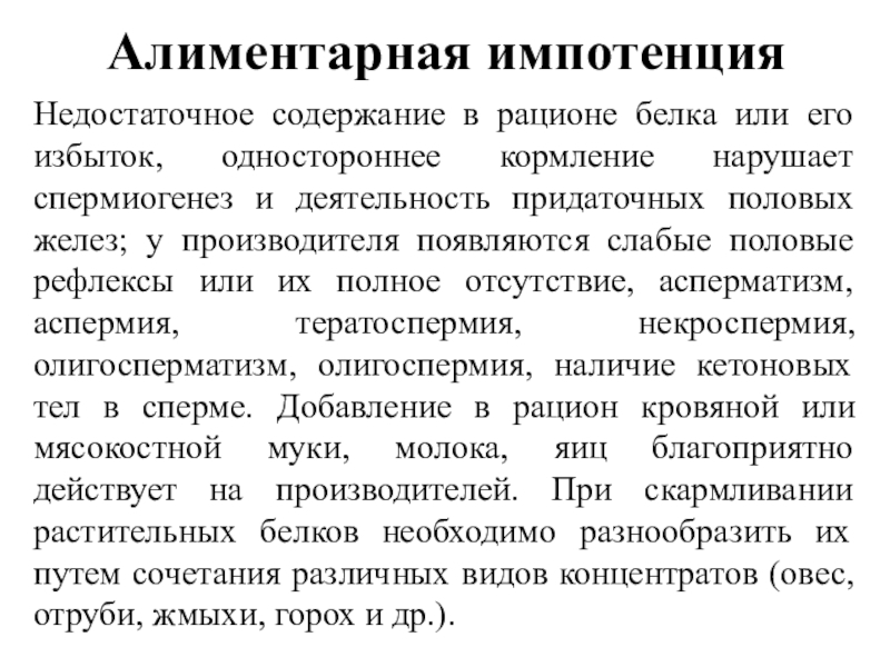 нарушает спермиогенез и деятельность придаточных половых желез; у производителя появляются слабые половые рефлексы или их полное отсутствие, асперматизм, аспермия, тератоспермия, некроспермия, олигосперматизм, олигоспермия, наличие кетоновых тел в сперме. Добавление в рацион кровяной или мясокостной муки, молока, яиц благоприятно действует на производителей. При скармливании растительных белков необходимо разнообразить их путем сочетания различных видов концентратов (овес, отруби, жмыхи, горох и др.).