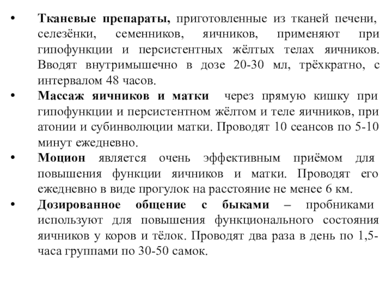 Дозированное общение с быками – пробниками используют для повышения функционального состояния яичников у коров и тёлок. Проводят два раза в день по 1,5- часа группами по 30-50 самок.